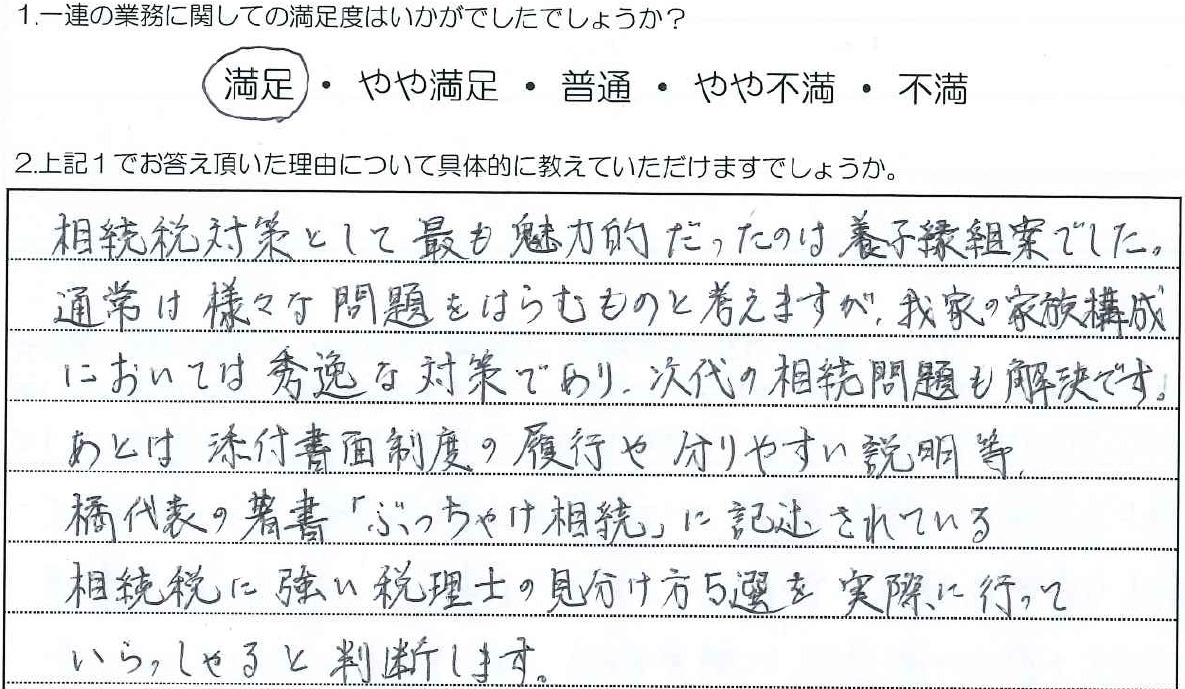 また円満相続税理士法人では、相続税申告だけではなく生前の対策も対応しております。お問い合わせ頂くお客様のうち半数は、相続が発生する前であり、1時間程度の有料の税務相談(対面やZOOM面談)により将来の相続に対する不安を解消することが出来るため大変好評です。税務相談では将来の相続税の概算試算や節税対策など重要なポイントを分かりやすく説明させて頂きます。是非ご検討ください。