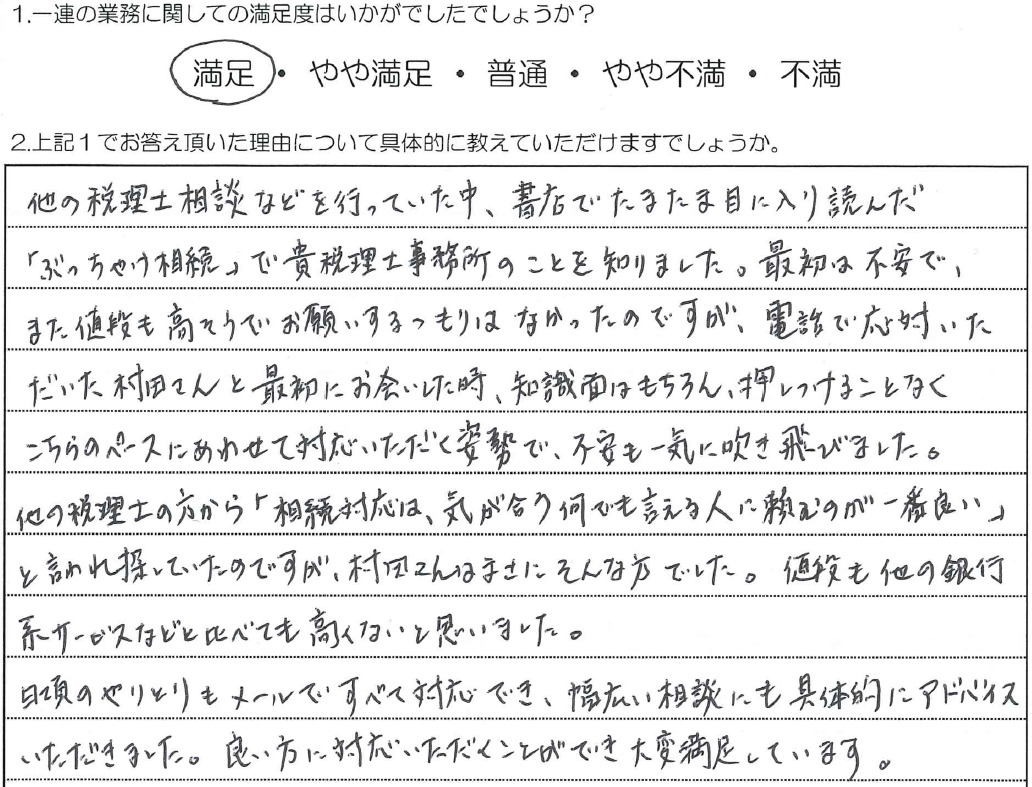相続税申告は専門性が高く、複雑な申告内容となるケースが少なくありません。間違いのない適正な申告書を作成するためには、お客様としっかりコミュニケーションをとり、正確な課税上の実態状況の把握が非常に大切です。これに加え、相続人のお気持ちを把握し2次相続なども踏まえた将来的な不安要素を解消することが求められています。このような問題に対応するために、「話しやすさ」や「分かりやすさ」に加えて「税理士の人間性」や「相続人との相性」も重要なポイントとなります。私はお客様に対してこれらのことを踏まえ「安心できる税理士」を常に目指し続けております。