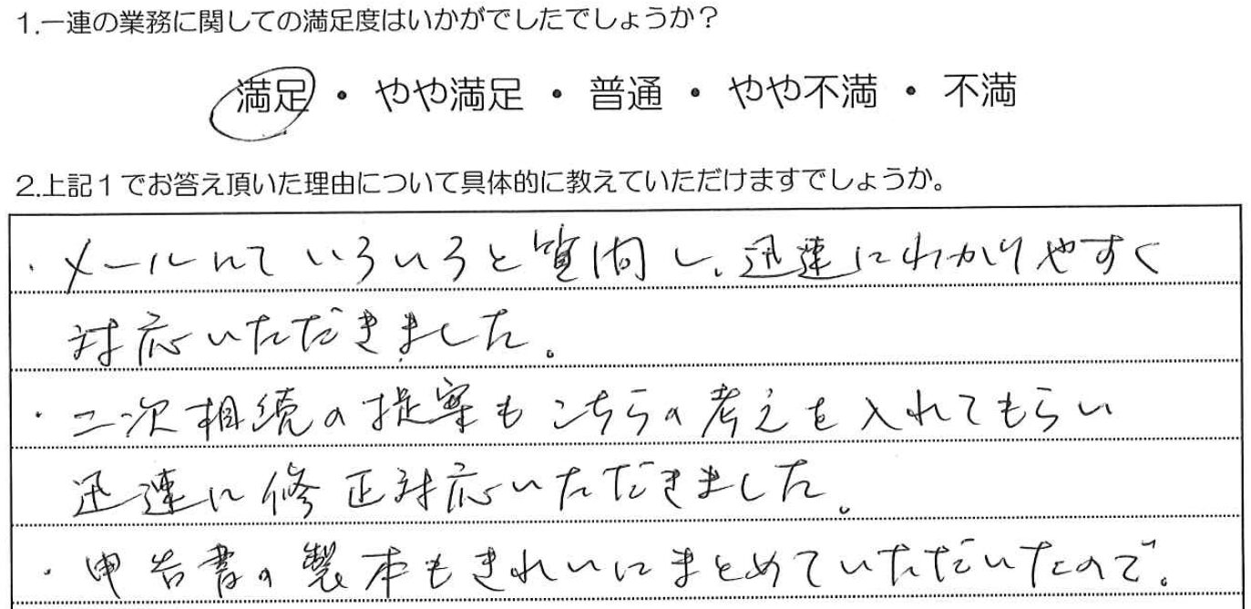 そして、ありがたいことに、相続税の申告手続きが完了した後のアンケートでは、担当税理士が最初から最後まで対応するため安心感があり、大変満足したとお声を多くいただいております。
