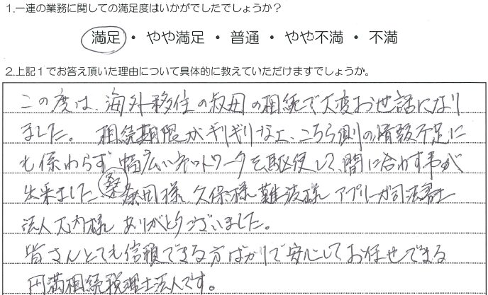 この度は海外移住の叔母の相続で大変お世話になりました。