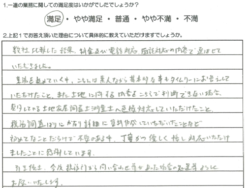 また土地に関する内容をこちらで判断できない場合、契約している土地家屋調査士測量士へ直接対応していただけたこと、税務調査ばりにかなり詳細に資料作成していただいたことなど