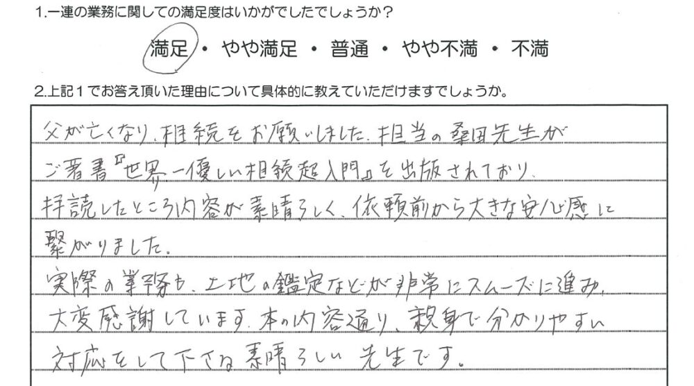 実際の業務も、土地の鑑定などが非常にスムーズに進み、大変感謝しています。本の内容通り、親身で分かりやすい対応をして下さる素晴らしい先生です。