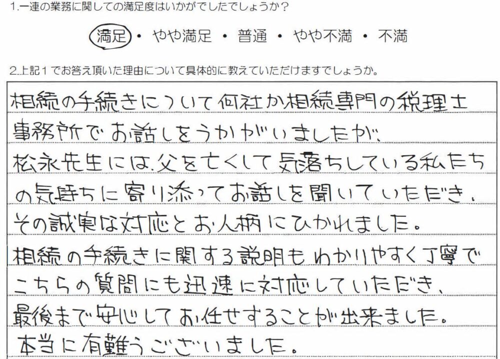 相続の手続きに関する説明もわかりやすく丁寧で こちらの質問にも迅速に対応していただき、