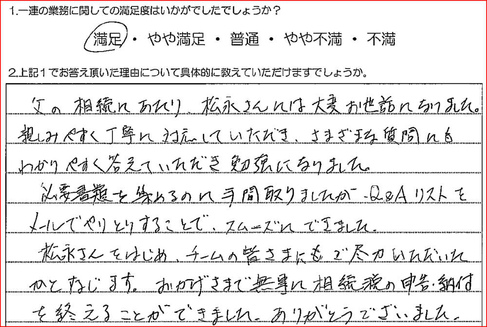 おかげさまで無事に相続税の申告・納付を終えることができました。ありがとうございました。