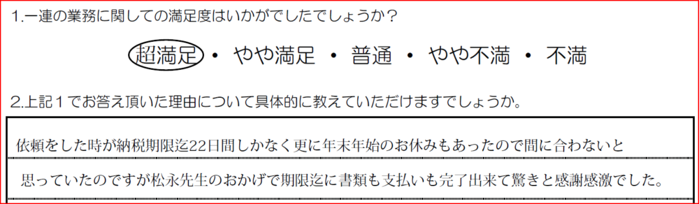 お客様の声 TOPお客様の声依頼をした時が納税期限迄22日間だったが間に合った 依頼をした時が納税期限迄22日間しかなく更に年末年始のお休みもあったので間に合わないと思っていたのですが、松永先生のおかげで期限迄に書類も支払いも完了出来て驚きと感謝感激でした。